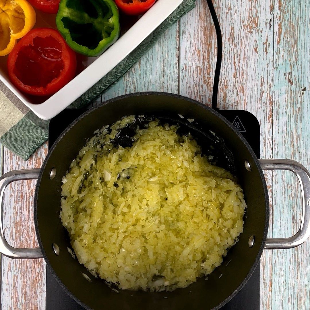 Chop the onions into small pieces and place them in a large pot with olive oil. Sauté over medium heat for 4 minutes by stirring occasionally.