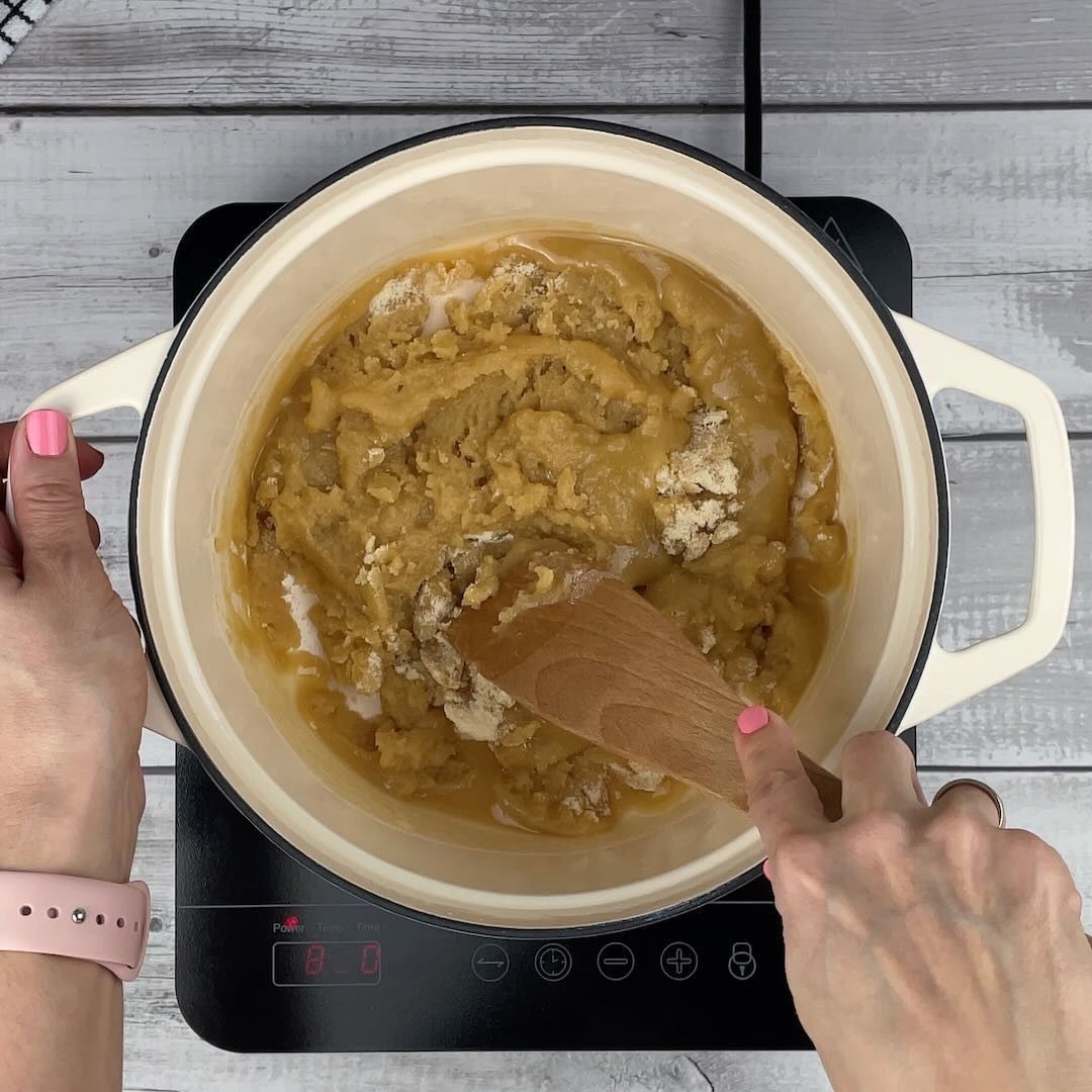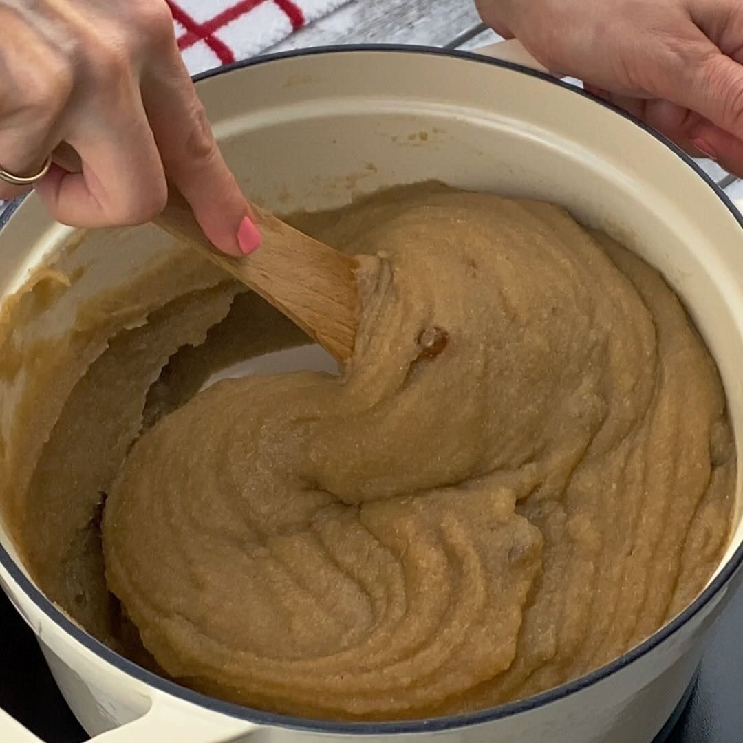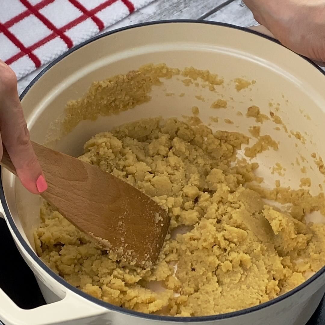 Carefully stir with a wooden spoon until the mixture turns to a golden brown hue. Take caution, semolina can easily become overcooked and charred!