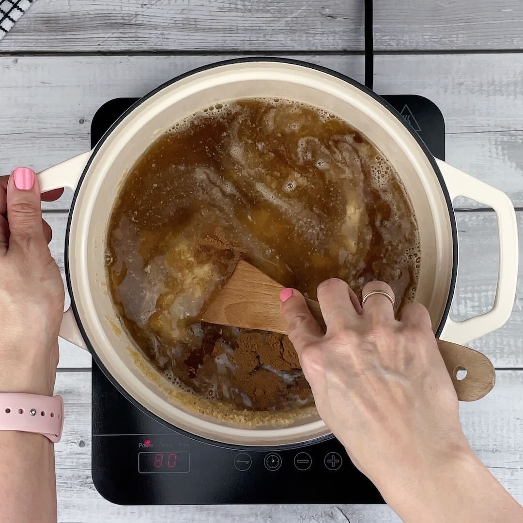 Subsequently, add the sugar, water, cinnamon, cloves, raisins and lemon zest to the mixture while stirring continuously on medium-low heat.